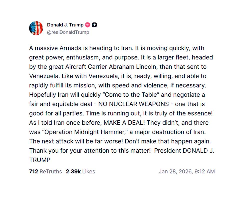 El mensaje publicado por Trump en Truth Social: «Una armada masiva se dirige a Irán. Se mueve rápidamente, con gran poder, entusiasmo y propósito. Es una flota más grande, encabezada por el gran portaaviones Abraham Lincoln, que la enviada a Venezuela. Al igual que Venezuela, está lista, dispuesta y es capaz de cumplir rápidamente su misión, con rapidez y violencia, si es necesario. Esperemos que Irán se siente rápidamente a la mesa de negociaciones y negocie un acuerdo justo y equitativo: SIN ARMAS NUCLEARES, uno que sea bueno para todas las partes. ¡El tiempo se acaba, es realmente esencial! Como le dije a Irán una vez antes: ¡HAGAN UN TRATO! No lo hicieron, y hubo la “Operación Martillo de Medianoche”, una gran destrucción de Irán. ¡El próximo ataque será mucho peor! No permitan que eso vuelva a suceder. ¡Gracias por su atención a este asunto! Presidente DONALD J. TRUMP»